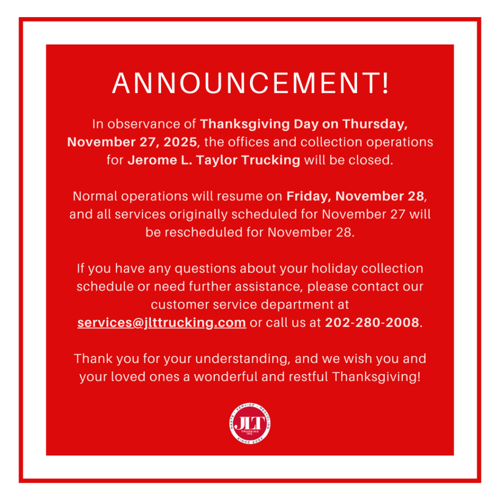 JLT Trucking is the Washington DC region’s most reliable rear load waste and recyclables collection company. Contact us today at 202-280-2008 or simply request a quote.